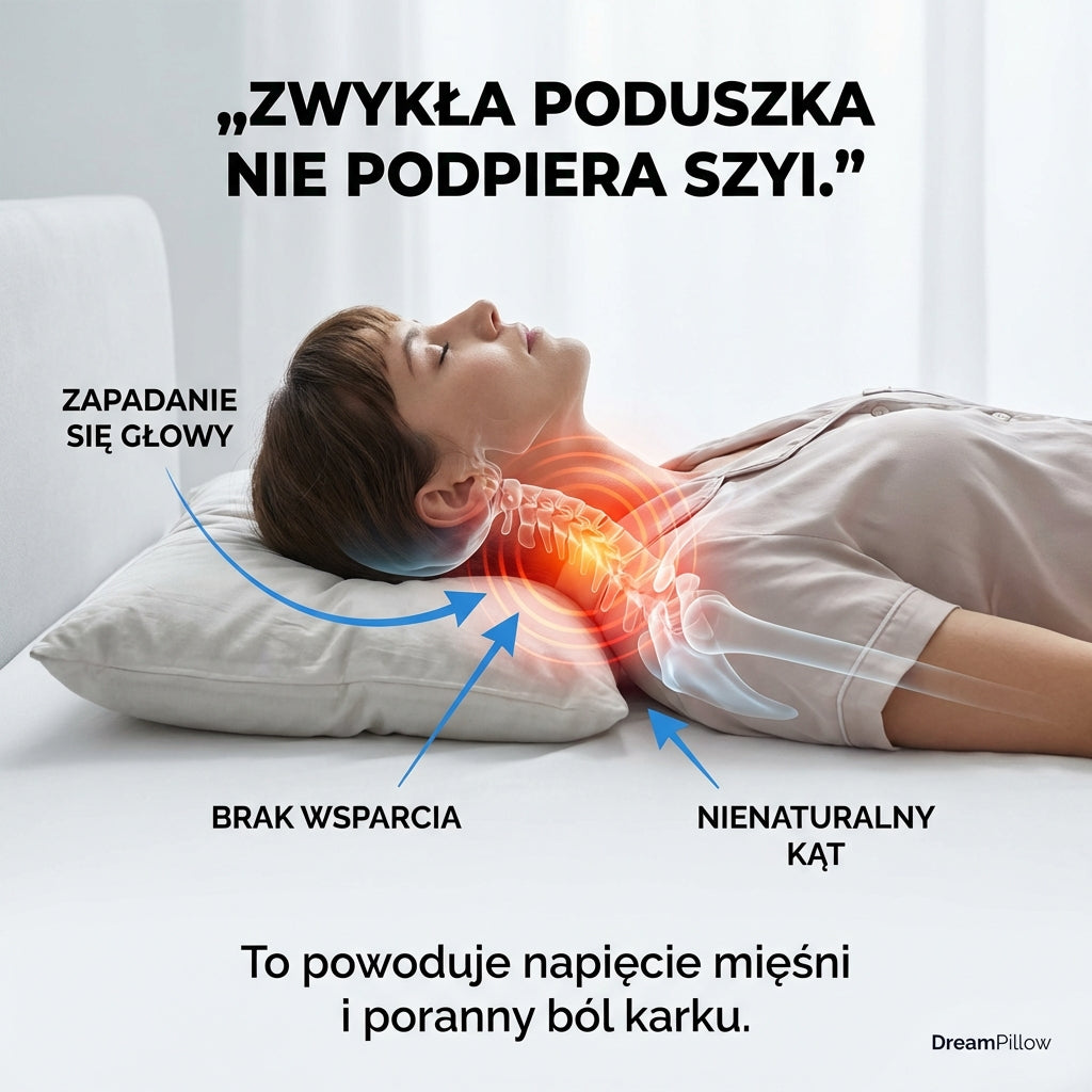 Zwykłe poduszki często zapadają się i nie utrzymują stabilnego podparcia szyi podczas snu. DreamPillow została zaprojektowana tak, aby lepiej dopasować się do naturalnej krzywizny szyi i zapewnić bardziej stabilne podparcie przez całą noc.